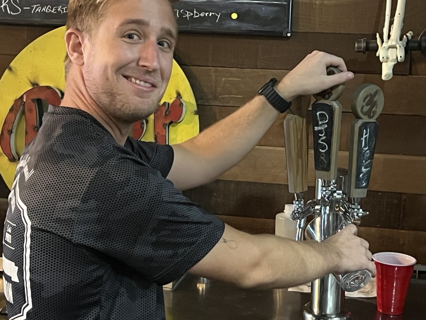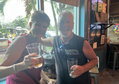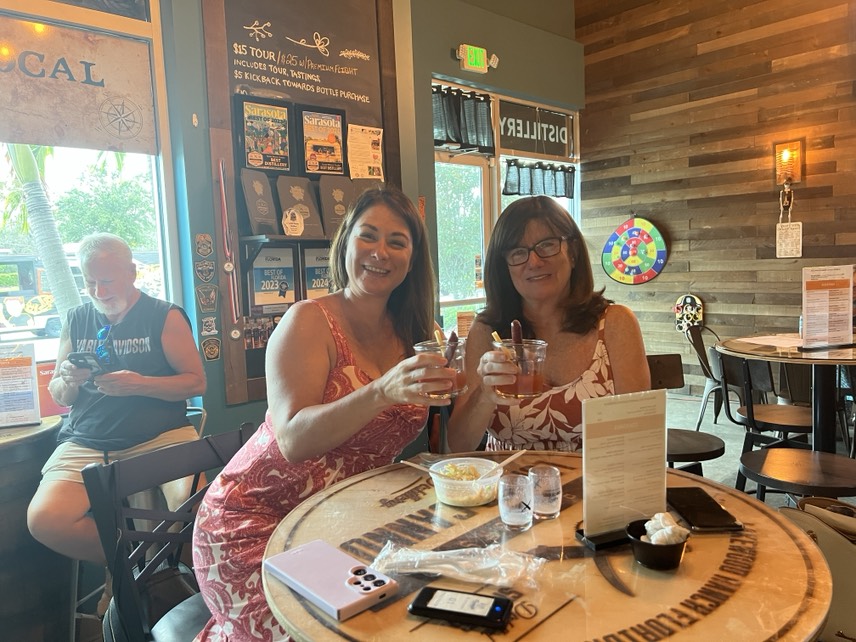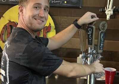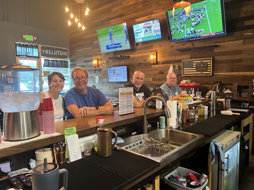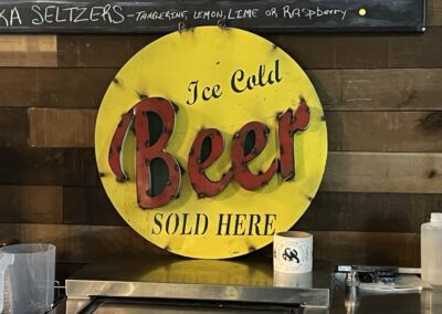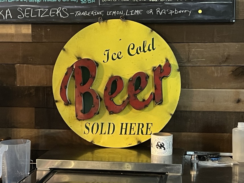 Welcome to our tasting room!   There are several items that might catch your eye first…the copper bar top, the huge reclaimed wood beam with copper draping lights, or maybe the large glass window looking into the production area.  Or, it might just be the model of the Loaded Cannon ship on the side wall!  Please don’t forget to check out the “facilities”, which would make a pirate proud!